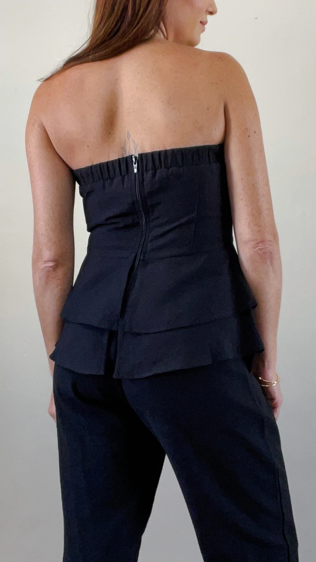 Descubra a Blusa Alfaiataria Leticia sem Alças Preta, uma peça sofisticada que valoriza seu visual com elegância. Seu design tomara que caia traz dois babados delicados, enquanto o elástico e o zíper na parte posterior garantem conforto e firmeza no decote.