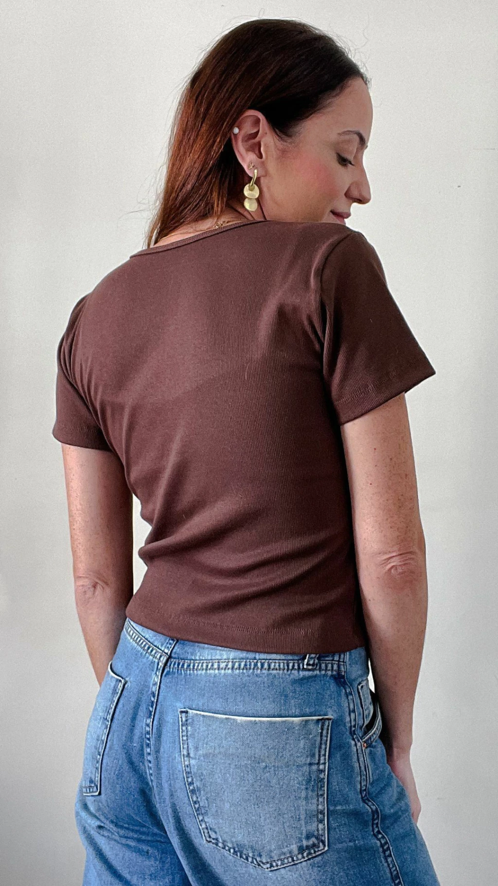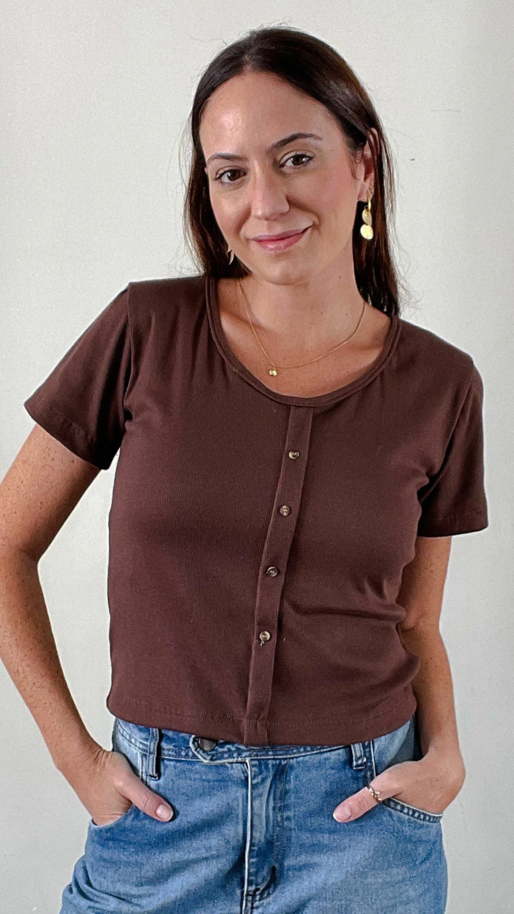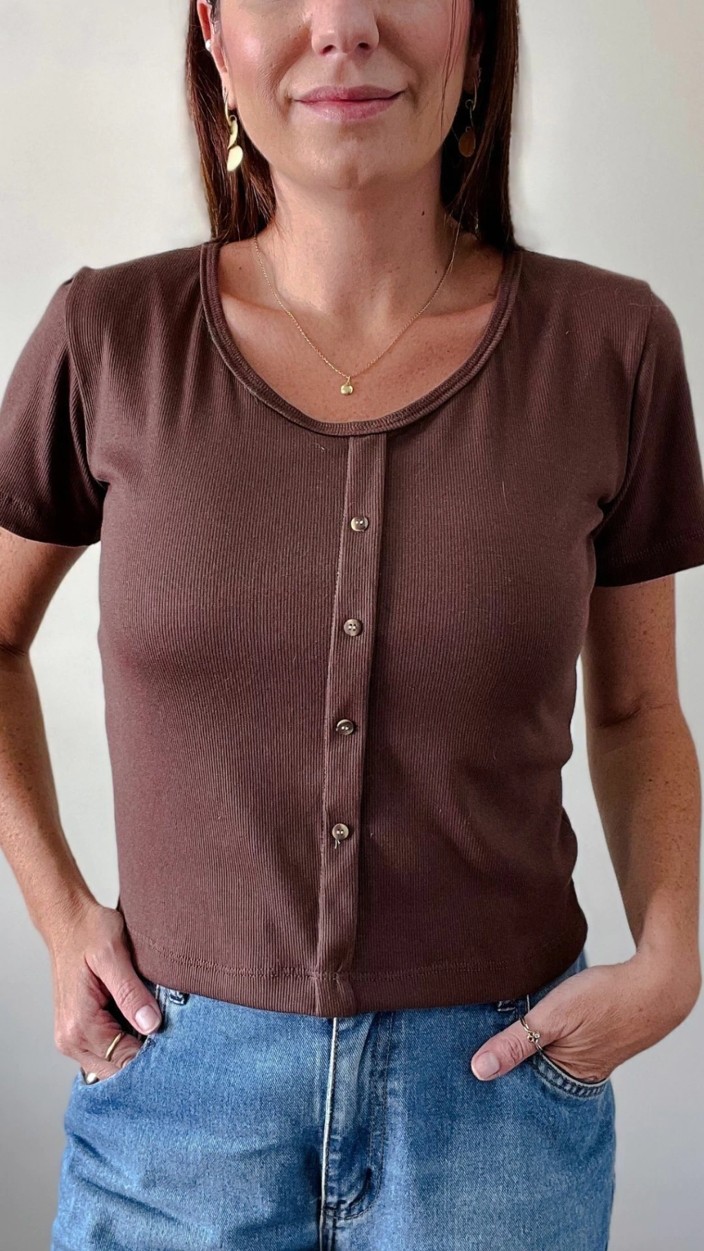 A Blusa Canelada com Mangas Curtas é a peça que você estava esperando! Com um corte de gola redonda e um encantador detalhe de botões na parte frontal, ela traz um toque de sofisticação ao seu look. O tecido com elastano proporciona um conforto incomparável e durabilidade, ideal para o dia a dia.