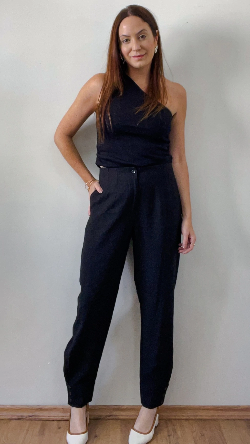 Descubra a Calça Alfaiataria Leticia Jogger Preta, perfeita para quem busca sofisticação com conforto. Com modelagem jogger sem cós, ela traz detalhes de costura frontal que valorizam a silhueta. O fechamento é feito com zíper e botão, enquanto os bolsos corte faca oferecem praticidade, mantendo o design limpo na parte posterior.