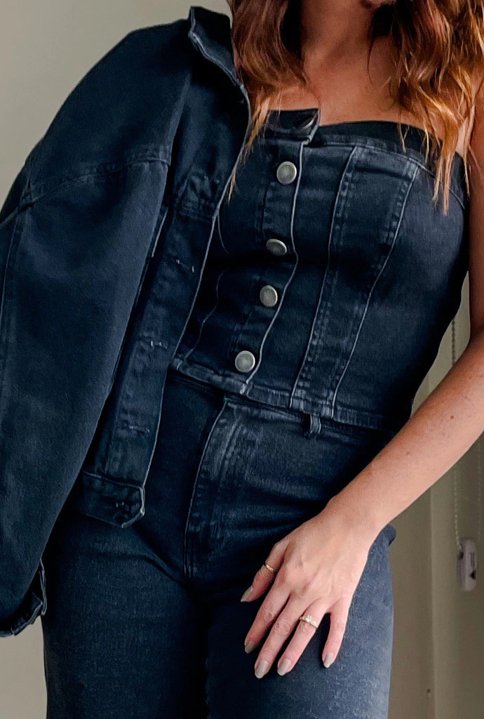 Corset Jeans, o TREND ALERT da vez!! Feito em jeans com lavagem estonada, o corset possui botões na frente aplicados. somente o primeiro botão abre, os demais são aplicados. O seu fechamento é feito em zíper de metal na lateral. O jeans do corset possui bastante elastano proporcionando conforto e ajuste perfeitos.