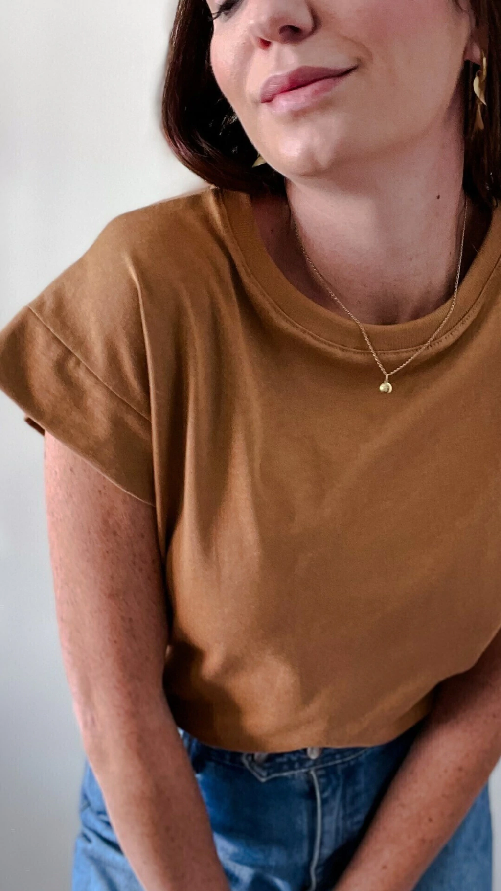 Camiseta feminina muscle básica, feita em malha, modelagem mais soltinha, com decote em punho e mangas no próprio tecido.