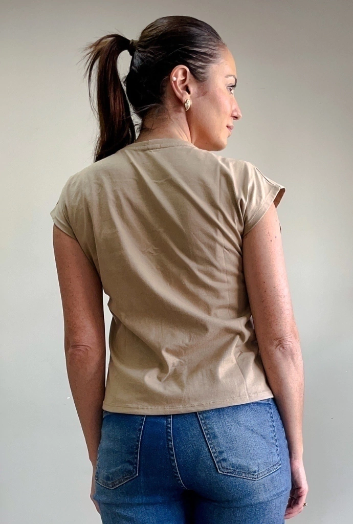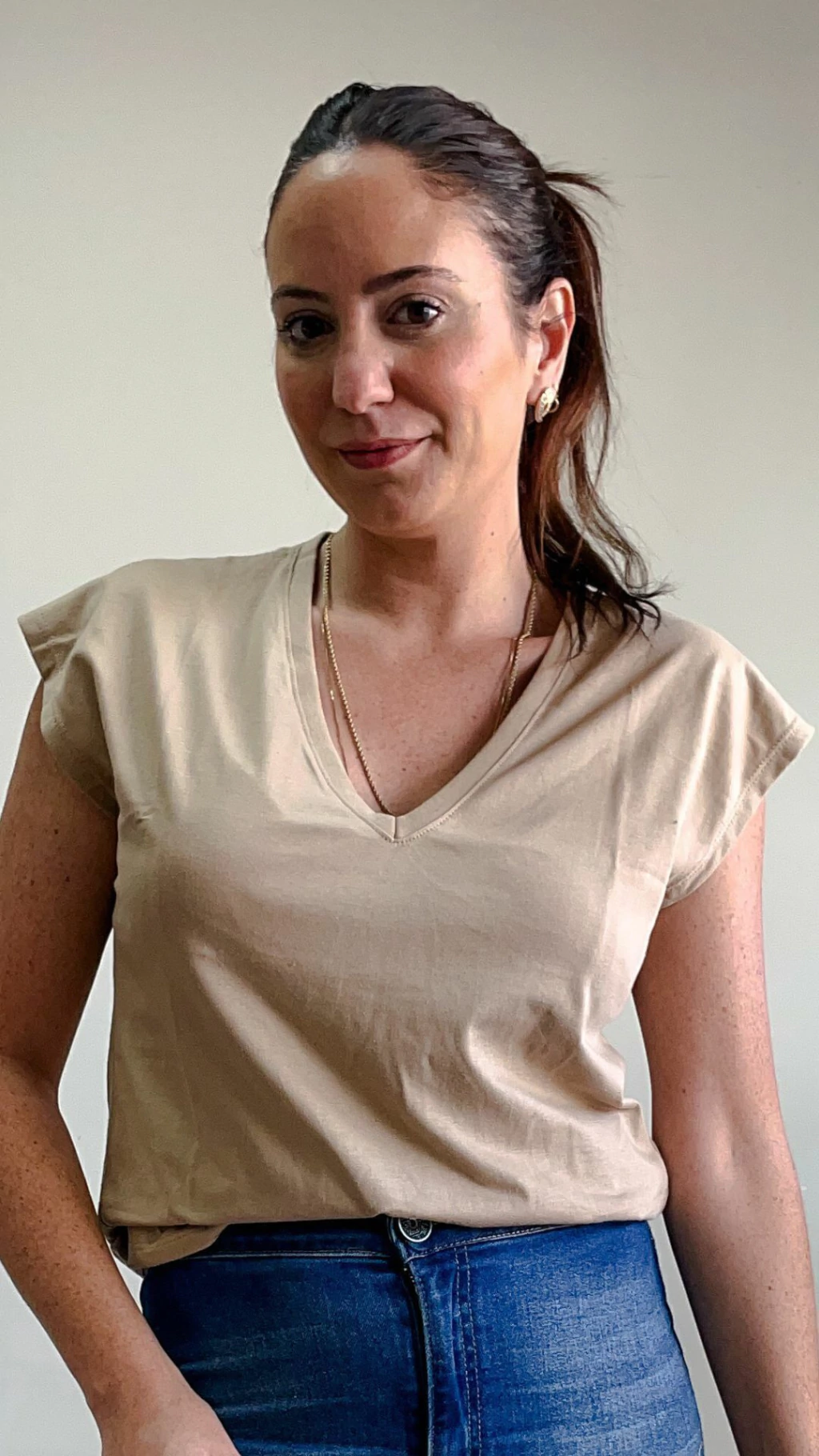 A muscle basic é a peça essencial no guarda-roupas da mulher prática e básica. O famoso armário cápsula tem como peça PRINCIPAL uma t-shirt básica com pegada moderna. Feita em malha, a modelagem é mais solta, com as mangas no estilo MUSCLE, aquela regata mais grossa e caindo um pouco para baixo do ombro, modelagem que surgiu em 2020 e não saiu mais das nossas produções. Seu decote é em V proporcionando um colo mais alongado.