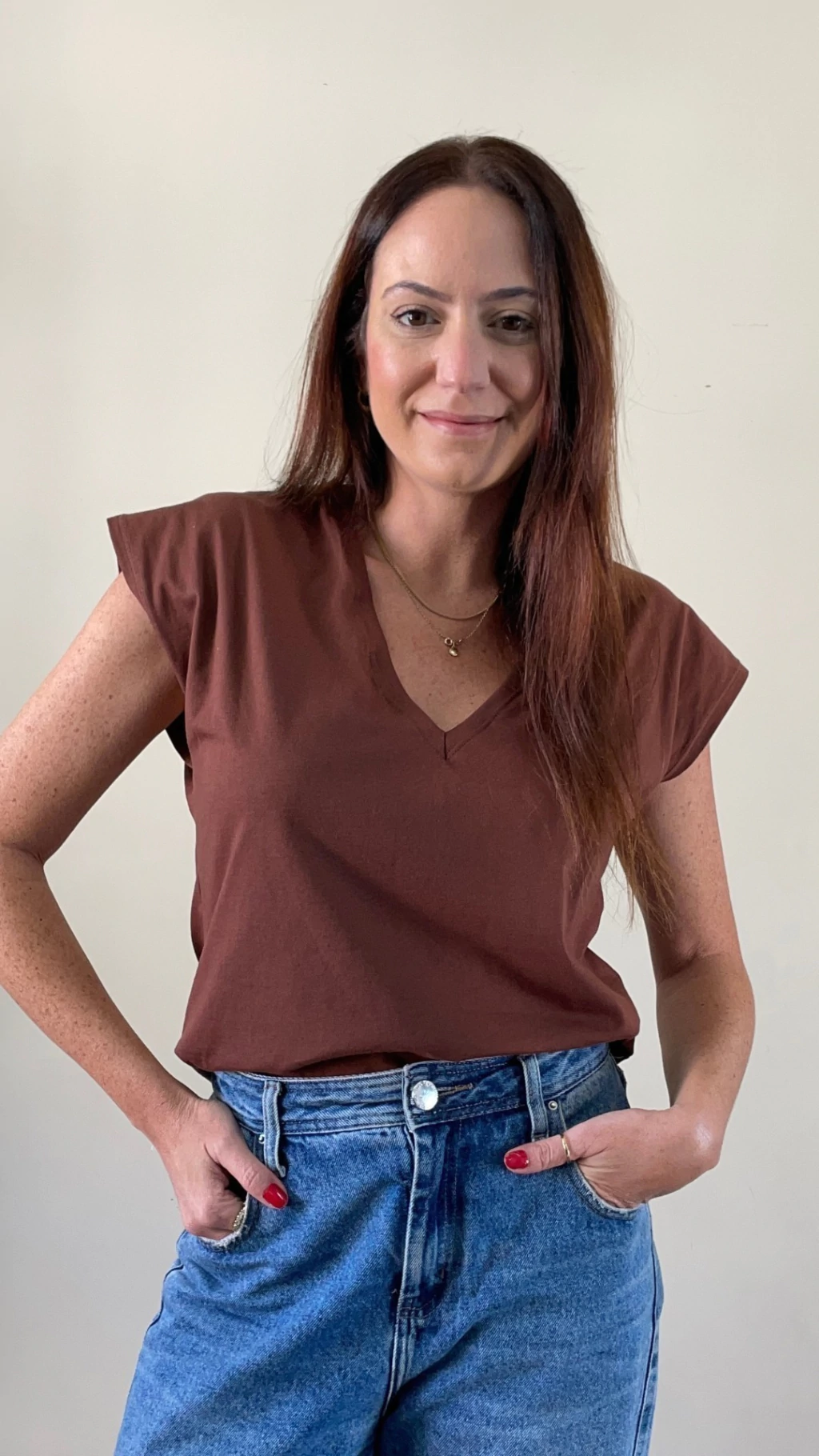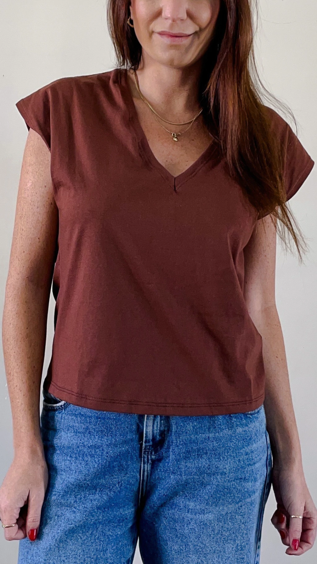 A muscle basic é a peça essencial no guarda-roupas da mulher prática e básica. O famoso armário cápsula tem como peça PRINCIPAL uma t-shirt básica com pegada moderna. Feita em malha, a modelagem é mais solta, com as mangas no estilo MUSCLE, aquela regata mais grossa e caindo um pouco para baixo do ombro, modelagem que surgiu em 2020 e não saiu mais das nossas produções. Seu decote é em V proporcionando um colo mais alongado.