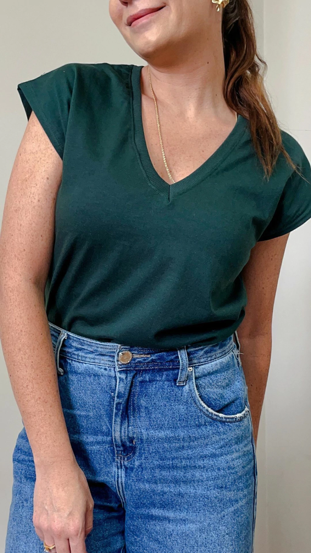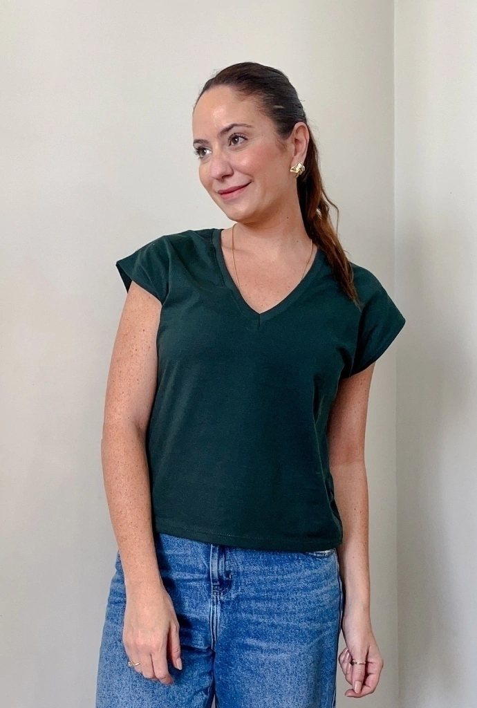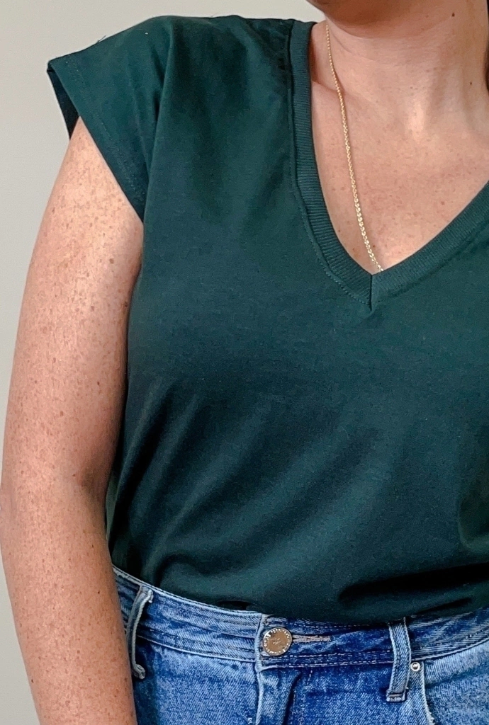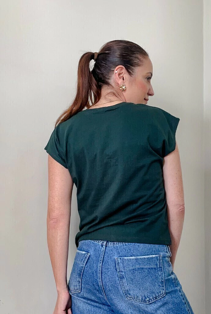 A muscle basic é a peça essencial no guarda-roupas da mulher prática e básica. O famoso armário cápsula tem como peça PRINCIPAL uma t-shirt básica com pegada moderna. Feita em malha, a modelagem é mais solta, com as mangas no estilo MUSCLE, aquela regata mais grossa e caindo um pouco para baixo do ombro, modelagem que surgiu em 2020 e não saiu mais das nossas produções. Seu decote é em V proporcionando um colo mais alongado.