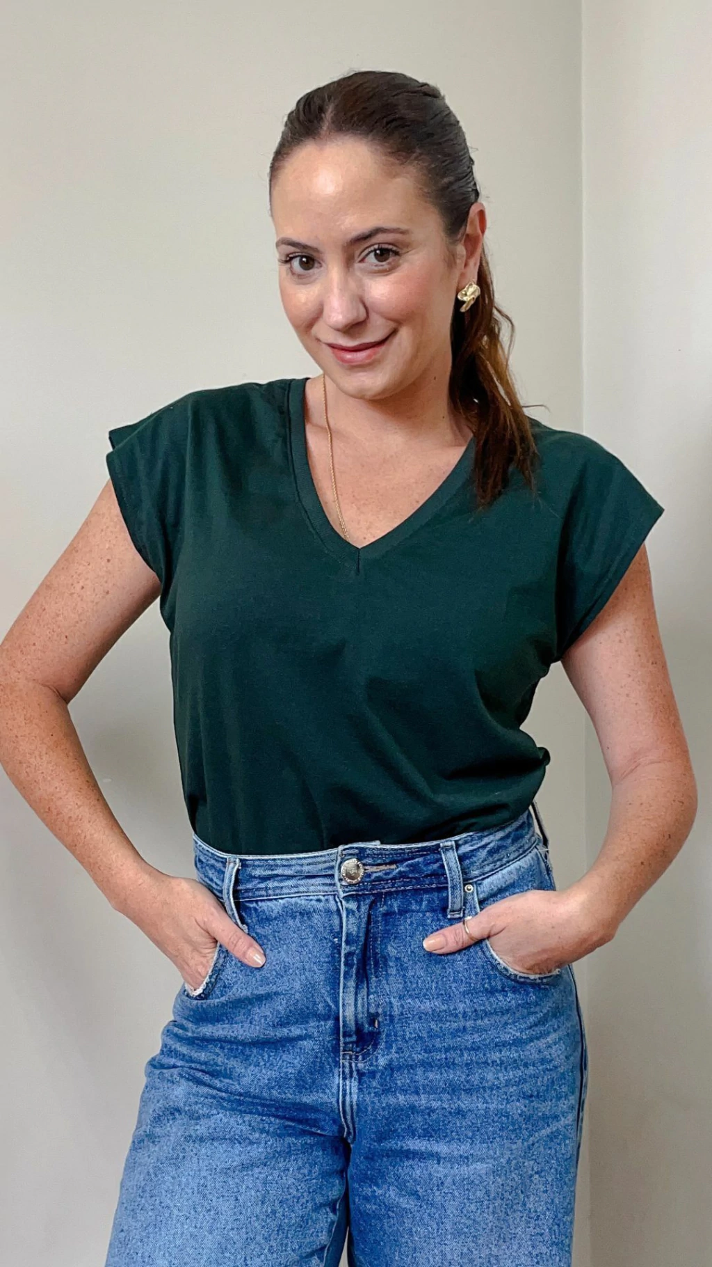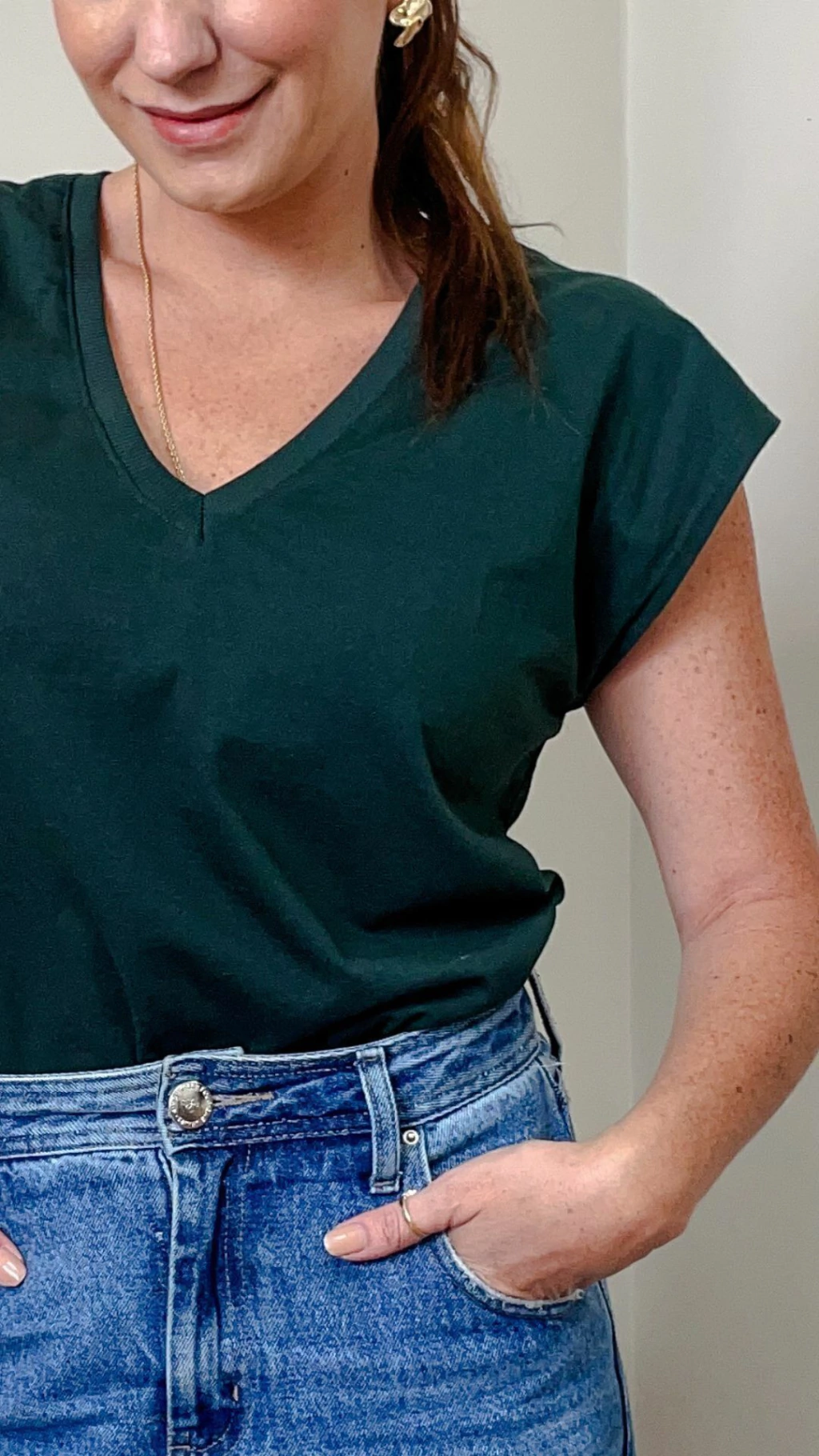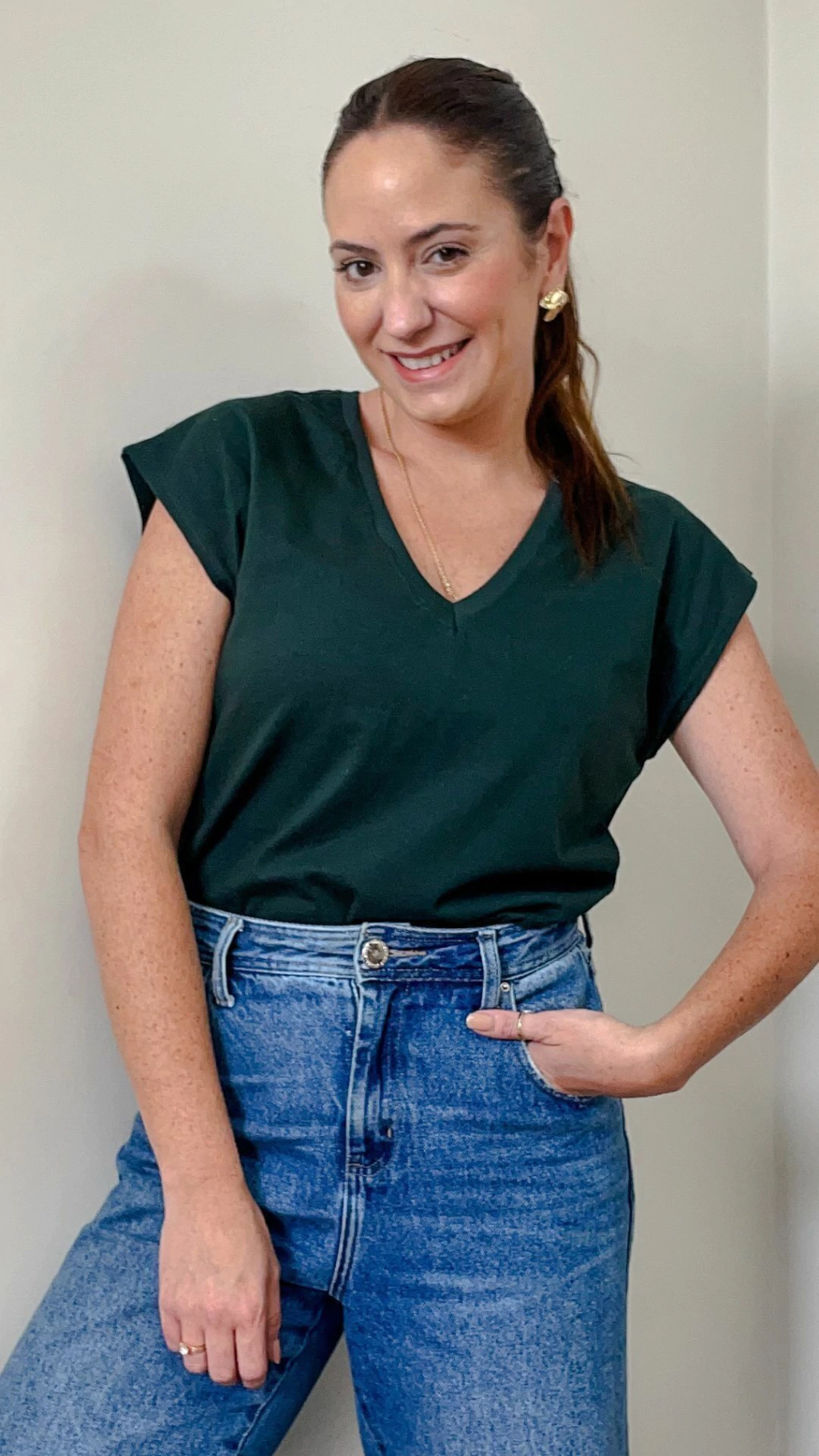 A muscle basic é a peça essencial no guarda-roupas da mulher prática e básica. O famoso armário cápsula tem como peça PRINCIPAL uma t-shirt básica com pegada moderna. Feita em malha, a modelagem é mais solta, com as mangas no estilo MUSCLE, aquela regata mais grossa e caindo um pouco para baixo do ombro, modelagem que surgiu em 2020 e não saiu mais das nossas produções. Seu decote é em V proporcionando um colo mais alongado.