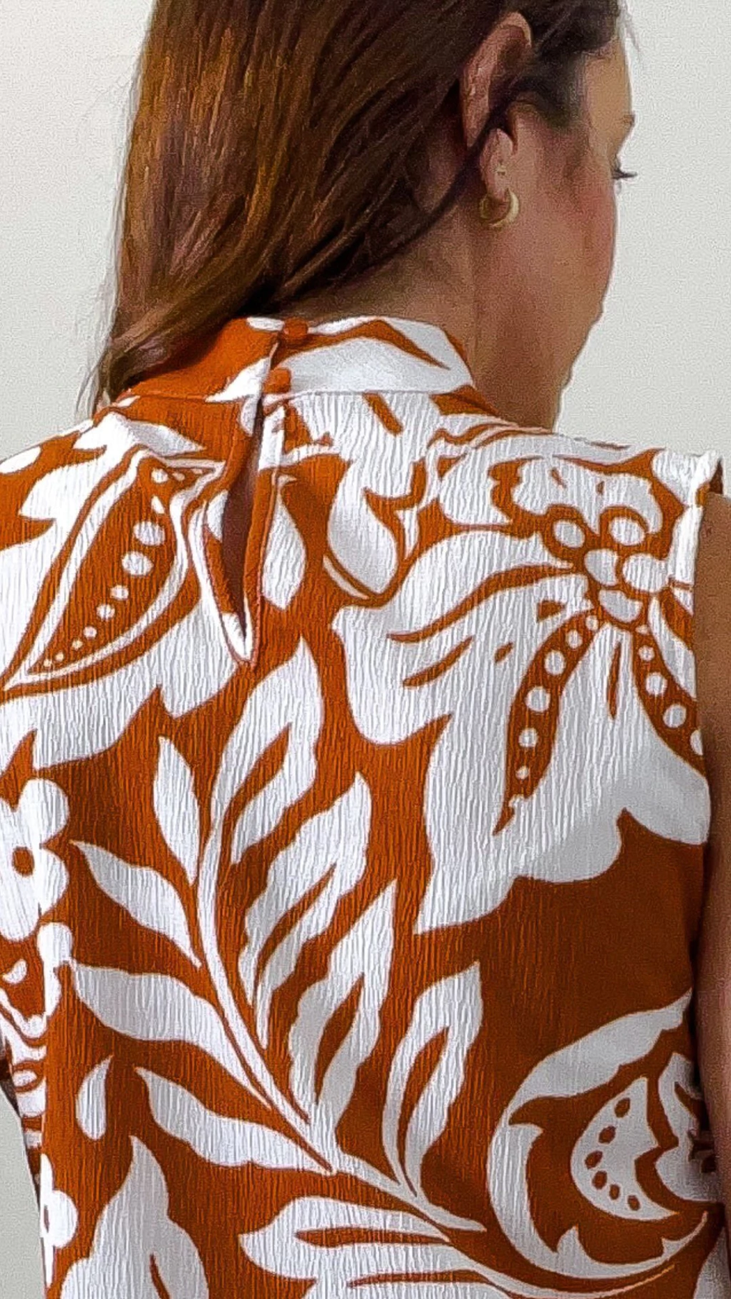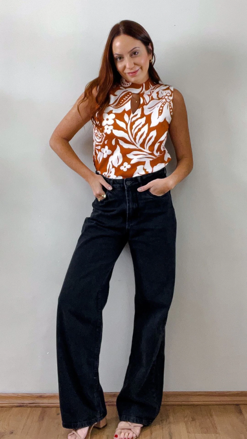 Descubra a Regata Relevo Estampa, a escolha perfeita para mulheres que buscam elegância e conforto! Com gola alta e fechamento posterior em botões, ela destaca sua estampa de folhagem sobre fundo marrom, conferindo sofisticação ao look. O tecido texturizado é super fresco, ideal para o trabalho e para emendar um happy hour com estilo.