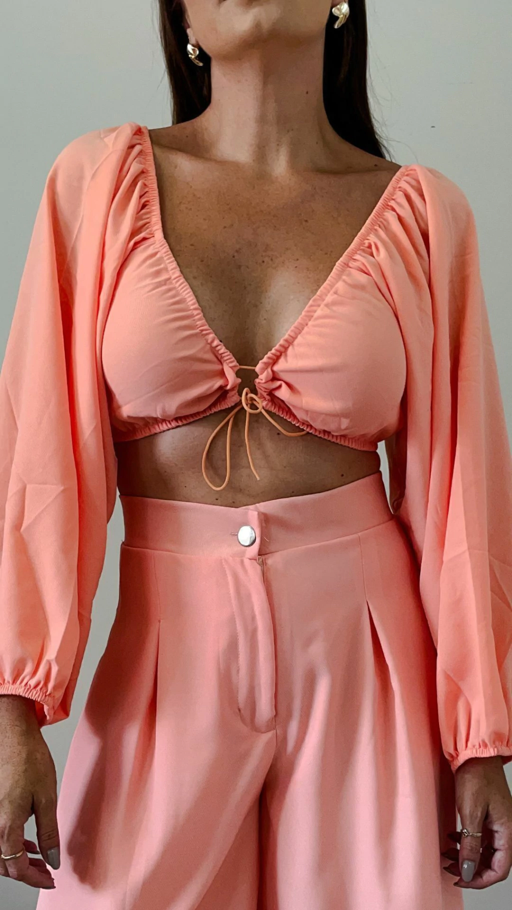 O Top Cropped Mabe Coral é a peça que vai transformar seu look! Com um decote ciganinha que destaca os ombros e mangas longas, ele é perfeito para qualquer ocasião, seja um encontro com as amigas ou um passeio no parque.