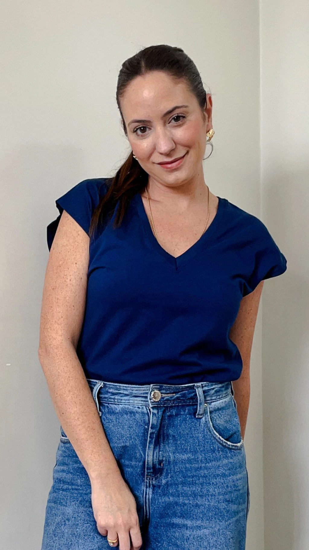A muscle basic é a peça essencial no guarda-roupas da mulher prática e básica. O famoso armário cápsula tem como peça PRINCIPAL uma t-shirt básica com pegada moderna. Feita em malha, a modelagem é mais solta, com as mangas no estilo MUSCLE, aquela regata mais grossa e caindo um pouco para baixo do ombro, modelagem que surgiu em 2020 e não saiu mais das nossas produções. Seu decote é em V proporcionando um colo mais alongado.